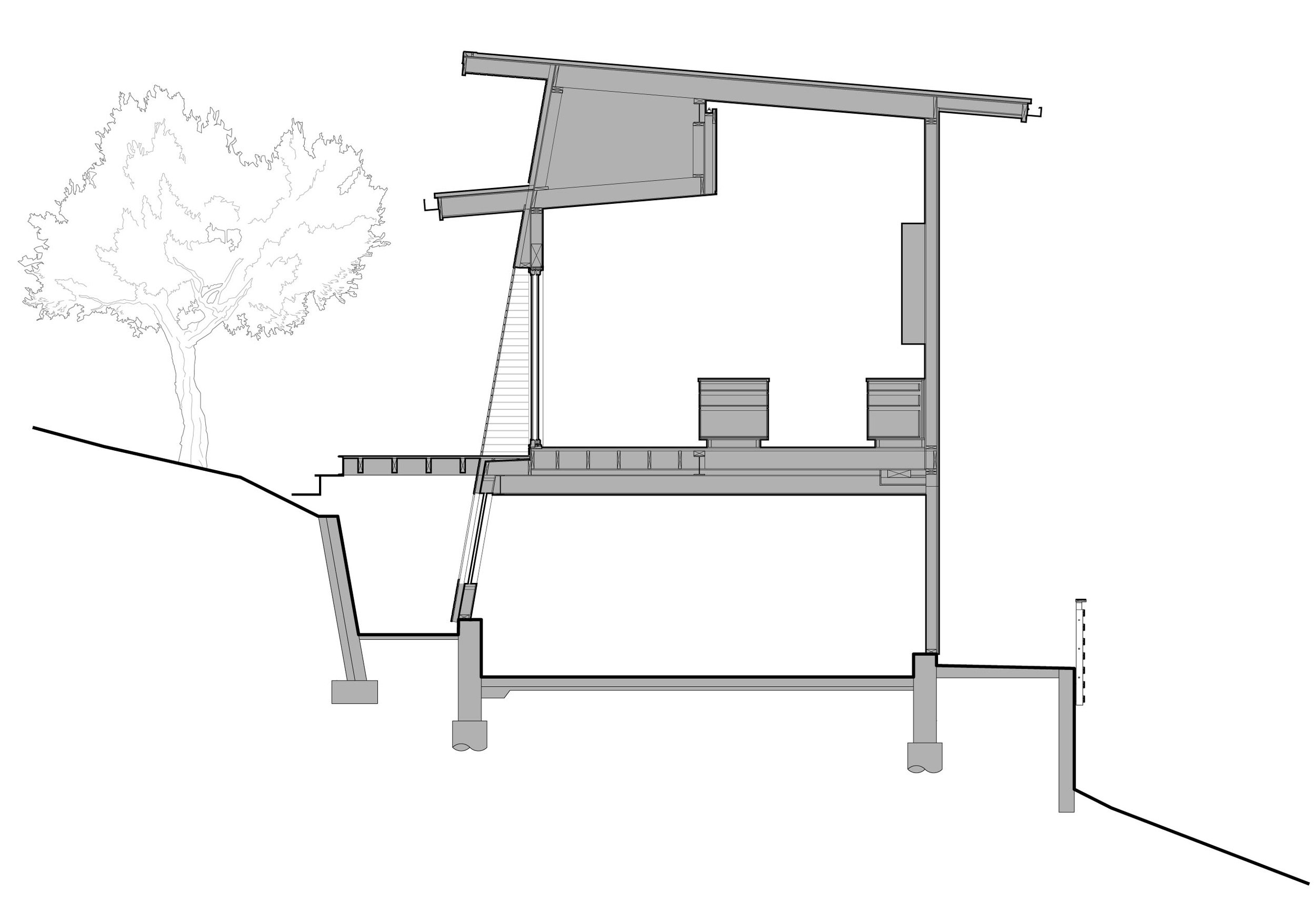 These bars are aligned to respond to the land and reveal the home’s functions, and each bar is terminated by a unique space, with the breakfast nook pop-out at one end and a home office at the other.
